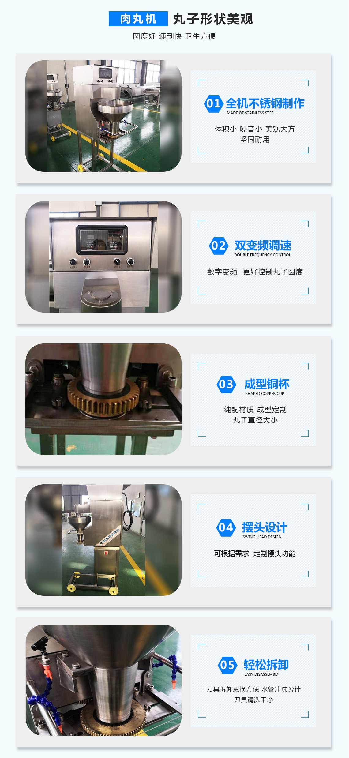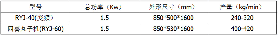 產(chǎn)品規(guī)格:RYJ-40(變頻)/四喜丸子機(RYJ-60)雙變頻調(diào)節(jié)好處:變頻調(diào)節(jié)可以使設(shè)備準(zhǔn)確的用數(shù)字控制丸子機的速度與頻率,在工人們每班交接時只需要交接好變頻器中的數(shù)字或者設(shè)備設(shè)定好數(shù)字即可,這樣生產(chǎn)出來的丸子直徑基本沒有誤差,保證了丸子的大小一致。