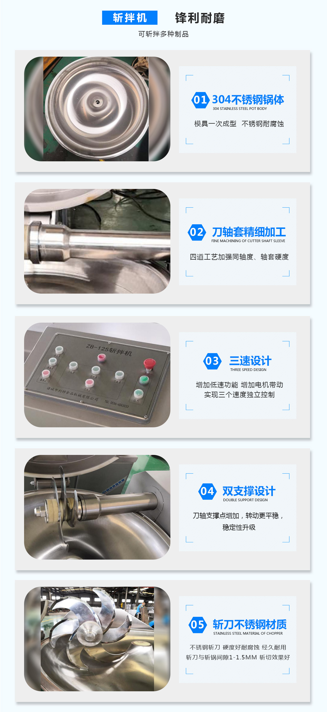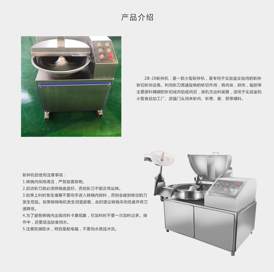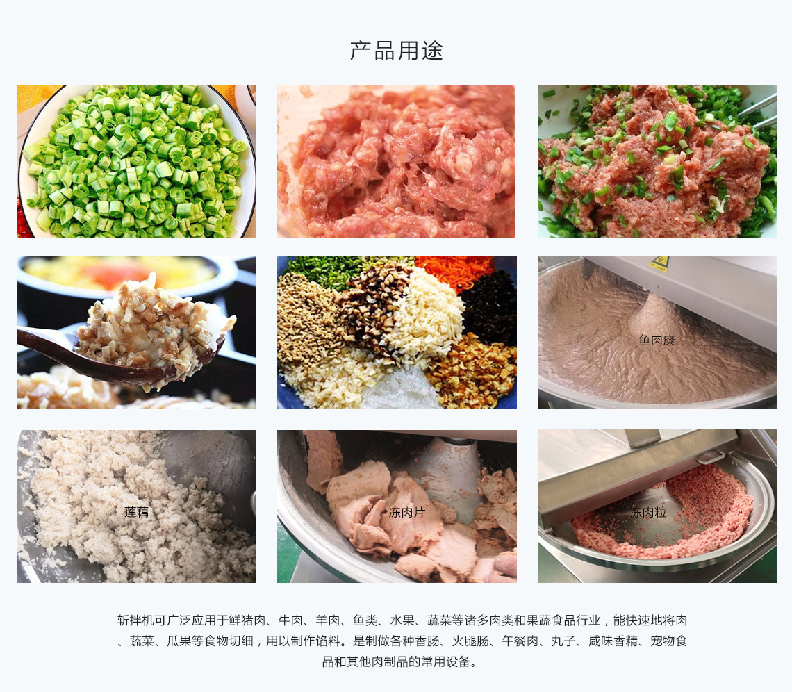 產(chǎn)品規(guī)格:ZB-20/ZB-40/ZB-80/ZB-125/ZB-200斬拌機主要利用高速旋轉(zhuǎn)斬切刀所產(chǎn)生的斬切力,將肉塊、碎肉、脂肪等主要原料在短時間內(nèi)斬切成肉餡肉泥,同時將其它原料如水,冰片,輔料一起攪拌成均勻的乳狀物。斬拌機廣泛應(yīng)用于水餃餡、餛飩餡、包子餡等餡料加工,香腸類、肉丸貢丸類等肉餡加工。