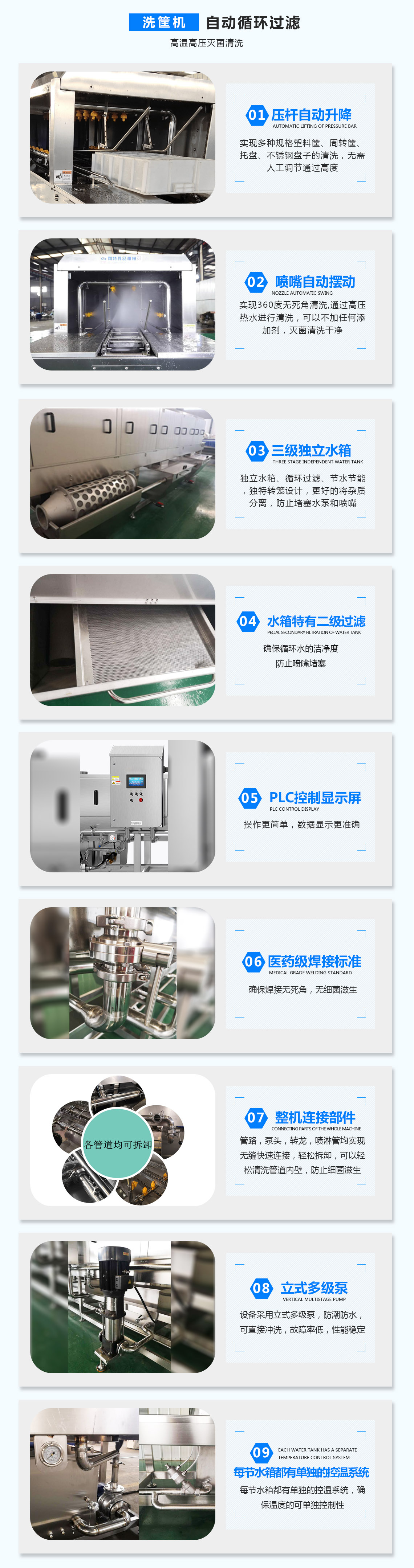 2、高壓清洗段:高溫高壓水流清洗,干凈清除油污及頑固雜質(zhì),達(dá)到清洗滅菌的目的。該清洗段配置了立式多級泵,性能穩(wěn)定,壓力大,水的沖擊力強(qiáng)。